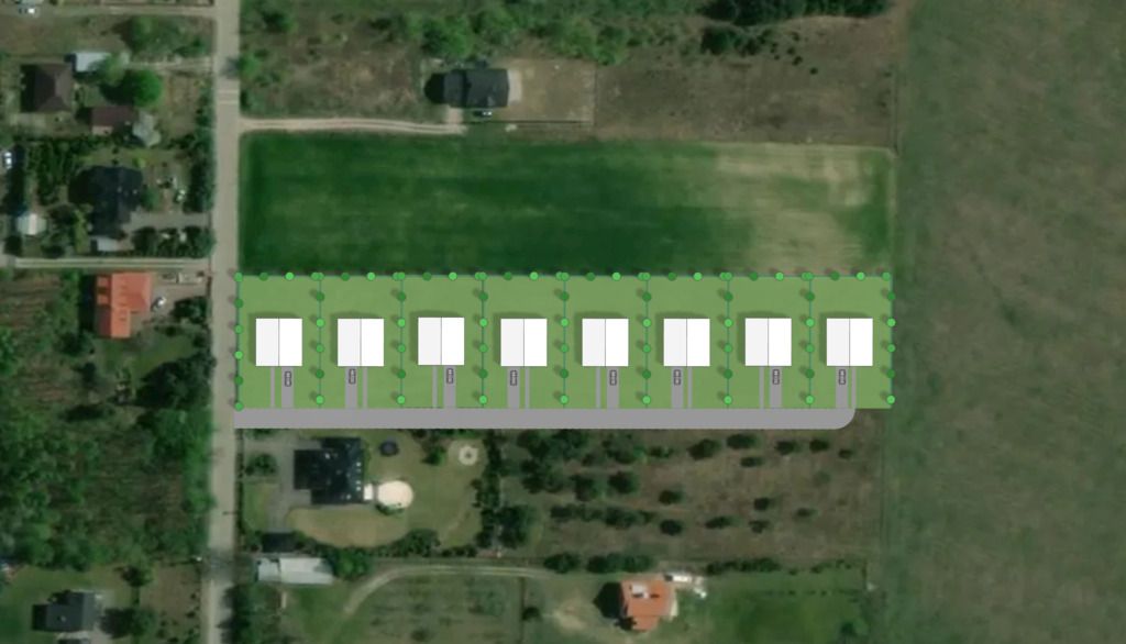 Działka w kształcie równego prostokąta o wymiarach ok. 38,5 x 187 m, płaska i niezadrzewiona. Dojazd drogą asfaltową. Wszystkie media znajdują się w drodze, tuż przy granicy działki: prąd, woda, kanalizacja. Minimalna powierzchnia działki według MPZP wynosi 800 m², co pozwala na efektywne wykorzystanie terenu przy inwestycji deweloperskiej.
