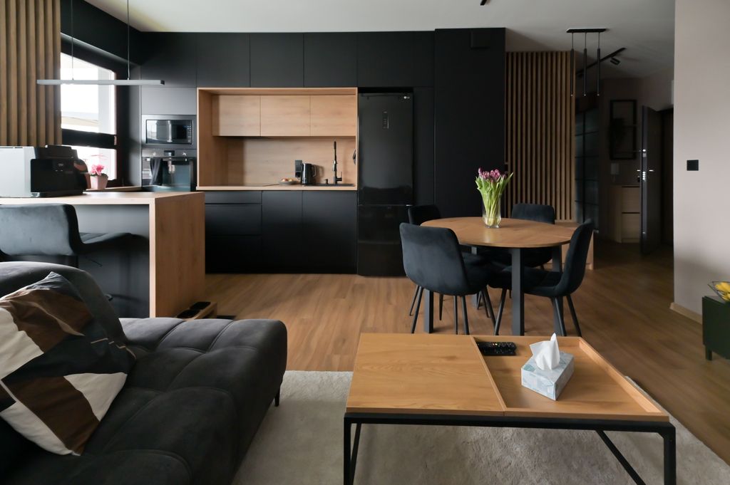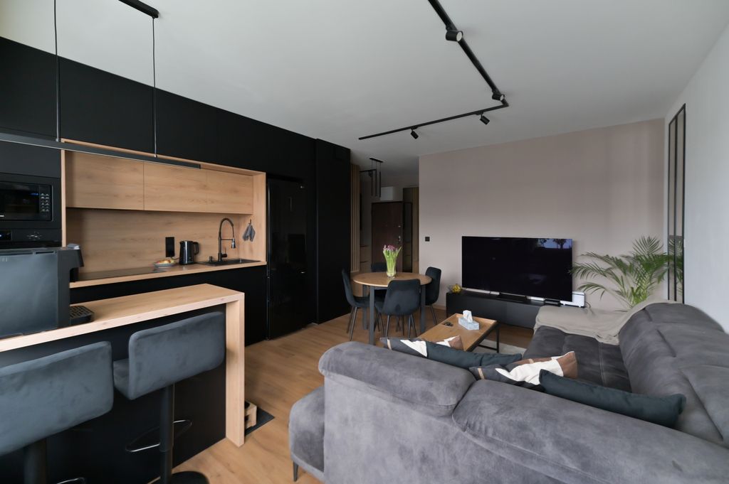 Mieszkanie zostało wykończone z dbałością o każdy detal, w spójnej i eleganckiej kolorystyce. Dzięki wysokiej jakości panelom winylowym na podłogach oraz nowoczesnemu oświetleniu, wnętrze jest przytulne i bardzo estetyczne.