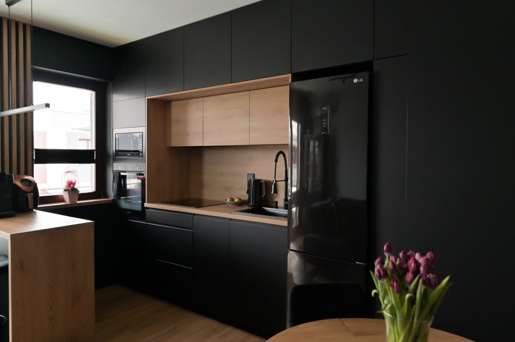 · Salon z aneksem kuchennym (23 m²): Serce domu. Kuchnia z meblami na wymiar, w pełni wyposażona w sprzęt AGD (lodówka LG, płyta indukcyjna, piekarnik, mikrofalówka, zmywarka). W salonie znajduje się klimatyzacja oraz komfortowa kanapa z funkcją elektrycznego sterowania. Duże przeszklenia z plisowanymi roletami doskonale doświetlają wnętrze.