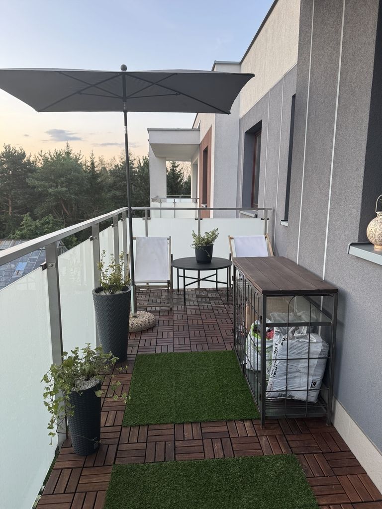 · Balkon (11 m²): Prawdziwa oaza wypoczynku wyłożona drewnem, z miejscem na zieleń. Spokojnie zmieszczą się wygodne meble ogrodowe.
